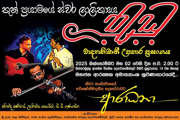 Arts Council of Sri Lanka, Music Advisory Board, Radio, Press and Social Media Advisory Board, Department of Cultural Affairs, Ministry of Buddhasasana, Religious and Cultural Affairs jointly organized the second Program of "Thudu" Vadyabhimani award concert will be held on September 12 at 5.03 PM at "Ape Gama" premises, Battaramulla